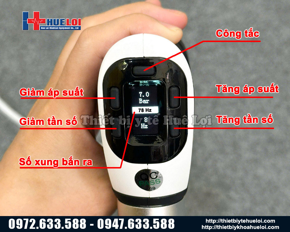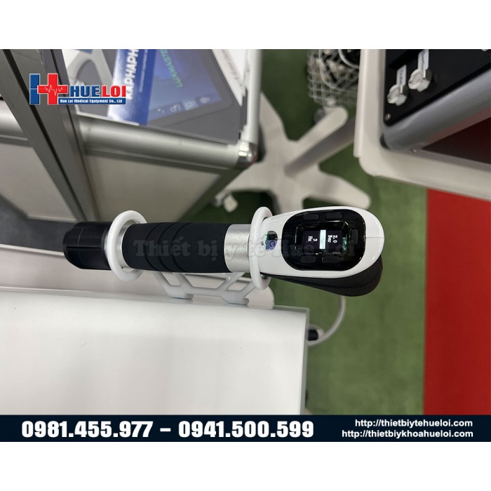 - Tay cầm tích hợp điều chỉnh tần số và cường độ, cho phép thao tác linh hoạt ngay trong quá trình điều trị mà không cần quay lại thân máy.