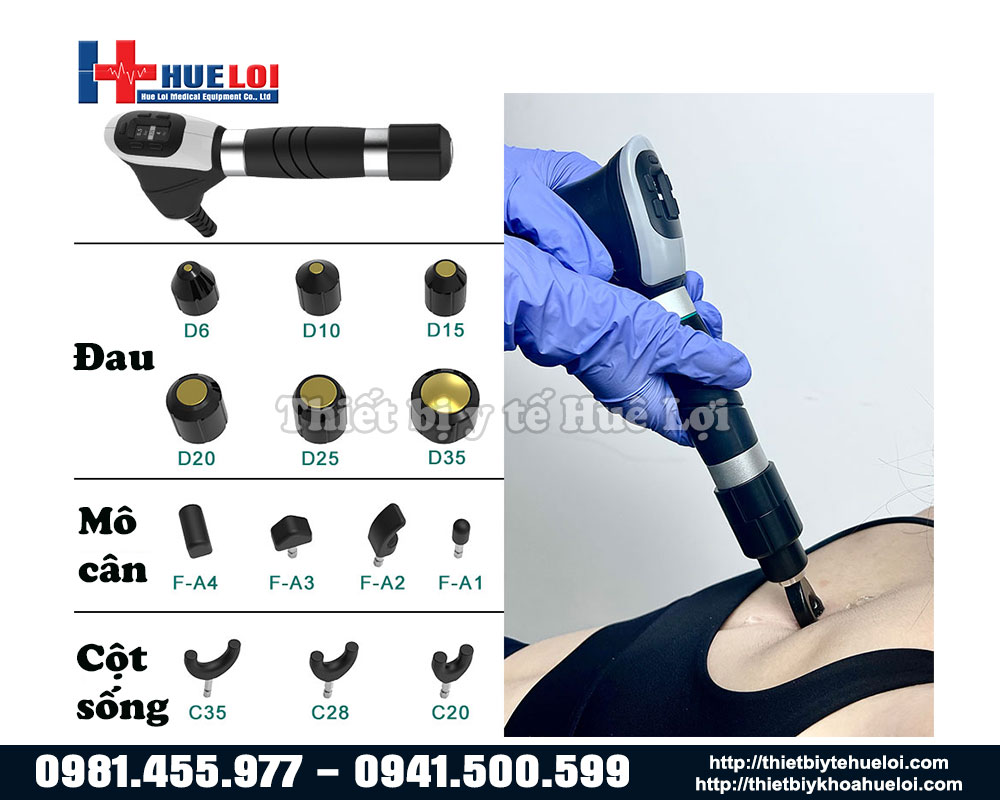 Ngoài ra, thiết bị đi kèm 13 đầu điều trị chuyên dụng: 6 đầu điều trị đau, 4 đầu cho mô cân và 3 đầu dành riêng cho vùng cột sống – giúp mở rộng phạm vi điều trị và phù hợp với nhiều nhóm bệnh lý khác nhau.