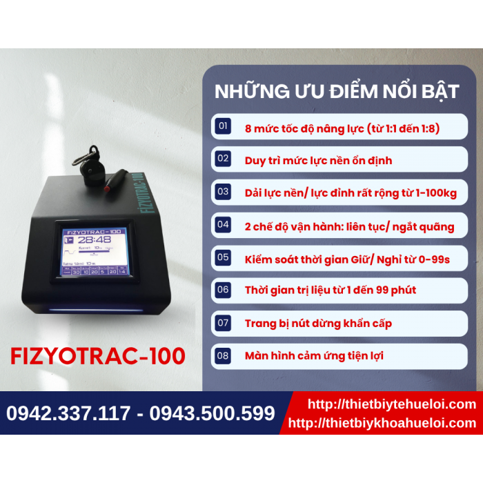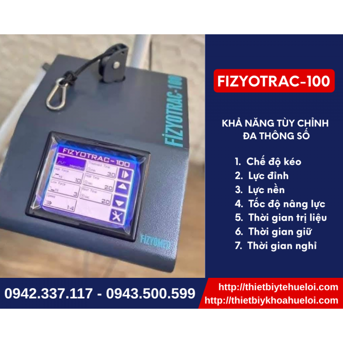 Xin lưu ý rằng, FIZYOTRAC-100 là một đầu kéo giãn trị liệu chuyên biệt. Để cấu thành một hệ thống kéo giãn hoàn chỉnh và phát huy tối đa công năng, thiết bị cần được kết hợp đồng bộ với một bàn kéo giãn chuyên dụng. Quý bác sĩ có thể tham khảo sản phẩm GIƯỜNG KÉO GIÃN CAO CẤP, hiện đang được Công ty TNHH Thiết Bị Y Tế Huê Lợi nhập khẩu và phân phối chính hãng, để đảm bảo tính tương thích và tối ưu hiệu quả trị liệu.
