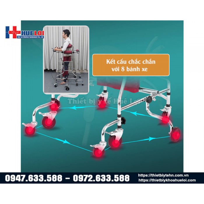- Hệ thống 8 bánh xe có khóa hãm, khi khóa lại có thể giúp cố định khung vững chắc, bánh xe được thiết kế xoay 360 °, có khả năng di chuyển linh hoạt, dễ dàng. Hệ thống 8 bánh xe này giúp xe chống nghiêng, chống lật, đảm bảo an toàn khi bệnh nhân tập đứng và tập đi.