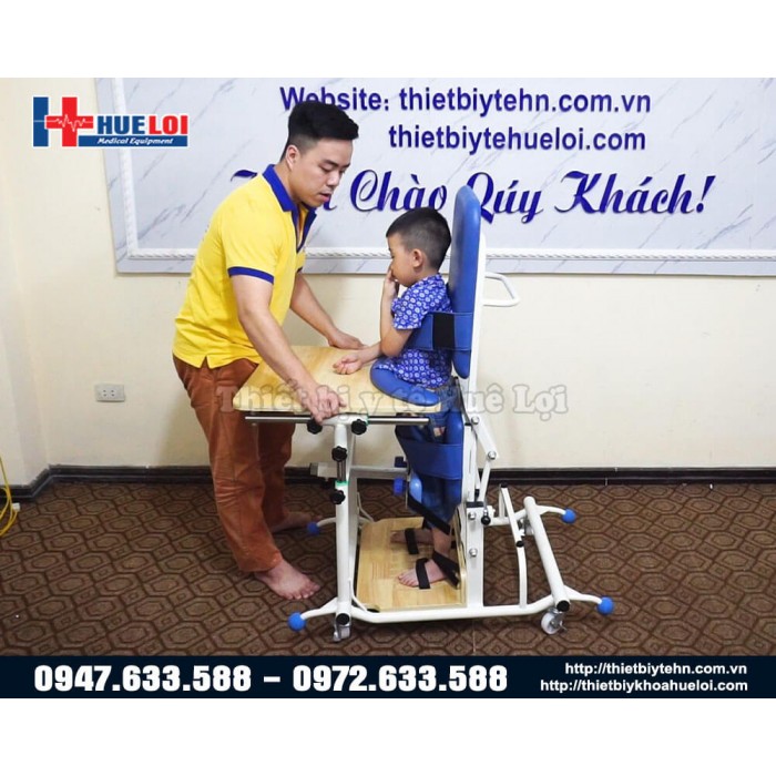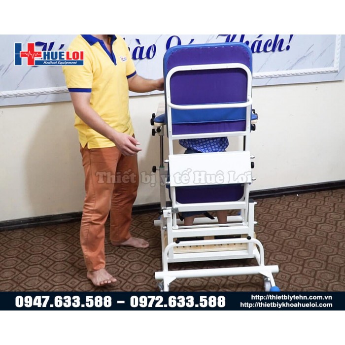 - Ở tư thế đứng: chuyển chiếc ghế về dạng đứng, cố định 2 đai lớn giữ người và đùi bệnh nhân, 2 đai nhỏ giữ cổ chân và bàn chân. Điều chỉnh miếng đệm đỡ đầu gối cẳng chân cho thoải mái. Sau khi bệnh nhân đã được cố định đứng vững, người nhà hoặc kỹ thuật viên hoàn toàn có thể đẩy bệnh nhân đi dạo một cách dễ dàng thông qua hệ thống bánh xe xoay 360 độ.
