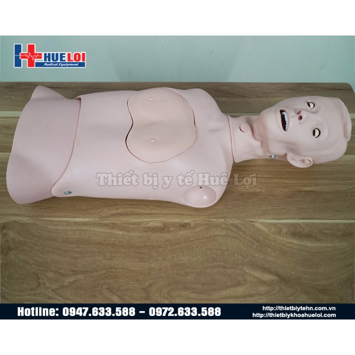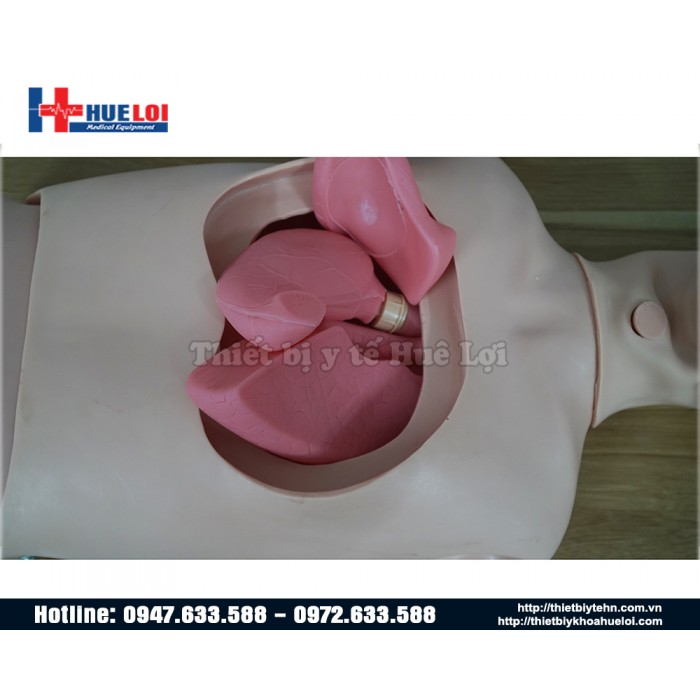 - Mô hình nửa thân trên của cơ thể với tỉ lệ 1:1 và có cấu tạo đầy đủ các cơ quan giải phẫu như khoang miệng, thực quản, khí quản, dạ dày, 2 lá phổi...