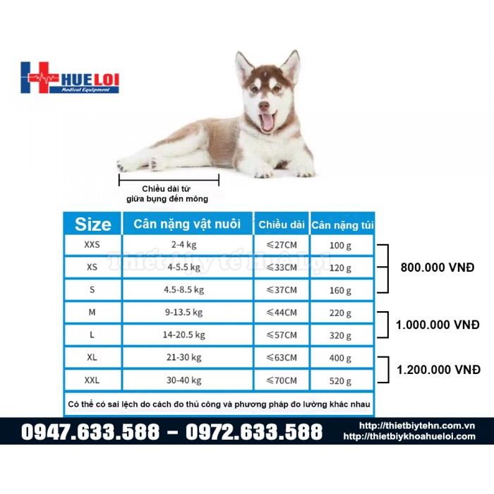 Thông số kỹ thuật túi bảo vệ chi sau cho chó:
